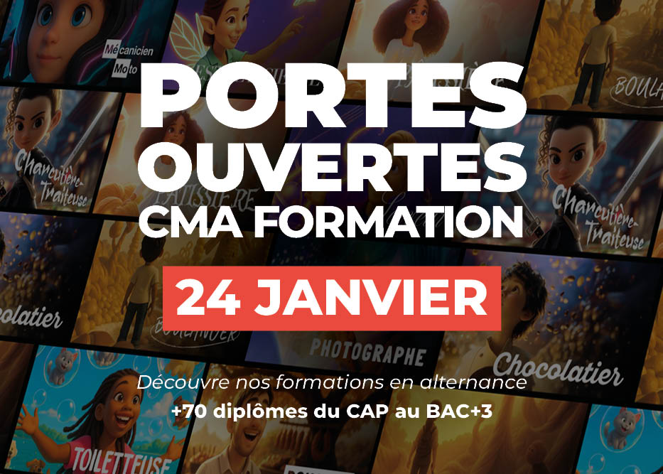 👉 Viens nous rencontrer lors de notre Journée Portes Ouvertes CMA Formation, le samedi 24 janvier, de 9h à 17h. Le moment idéal pour découvrir nos formations, comprendre l’apprentissage et te projeter concrètement dans ton futur métier.