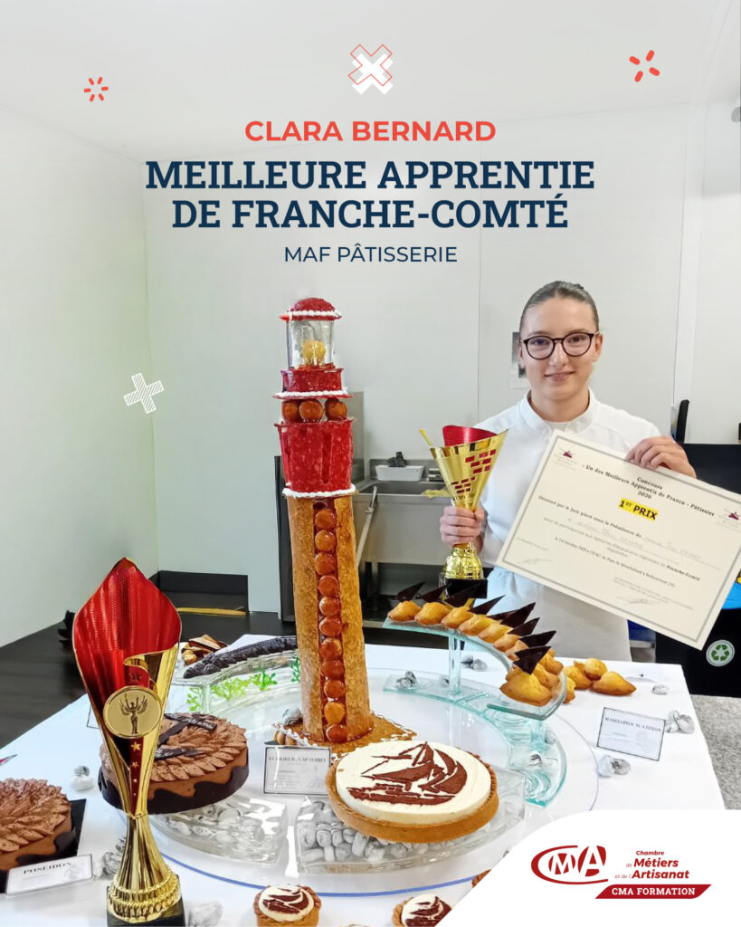 Clara Bernard, apprentie en CS Pùtisserie de Boutique à CMA Formation Vesoul, a décroché le prestigieux titre de Meilleure Apprentie de Franche-Comté (MAF Pùtisserie) lors du concours organisé à Montbéliard.